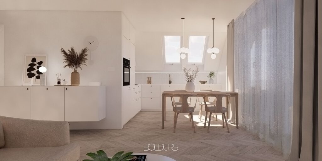 White represents a timeless elegance while also creating a clean and fresh look. In this kitchen under the slope ceiling, it also helps create the illusion of more height and depth, giving the room a more spacious and expansive feel.