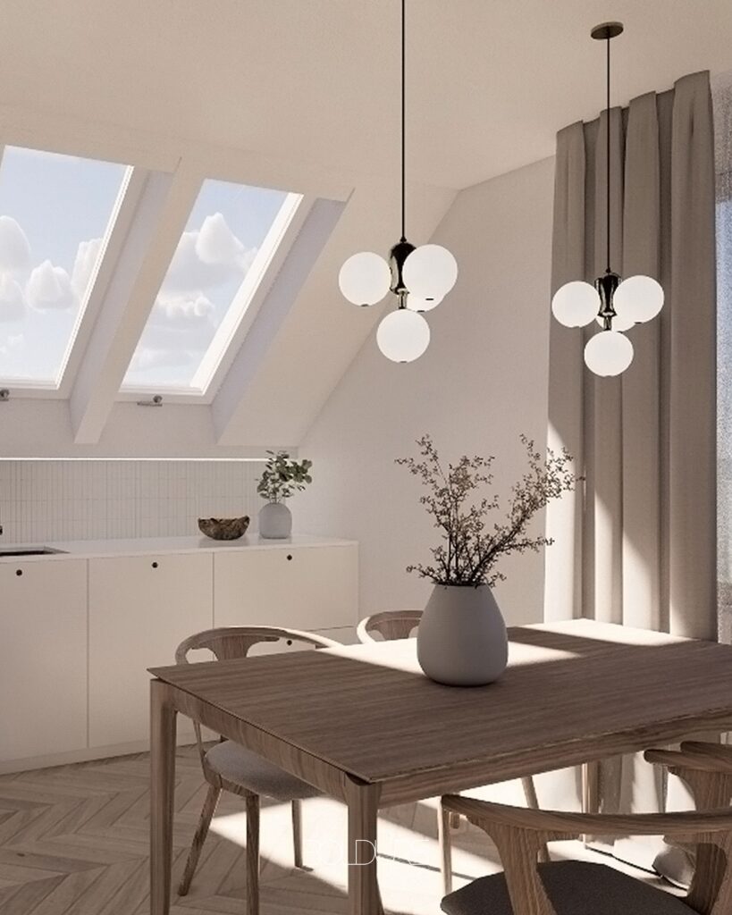 Although the kitchen is placed under a sloping ceiling, it still feels open and airy, right?
