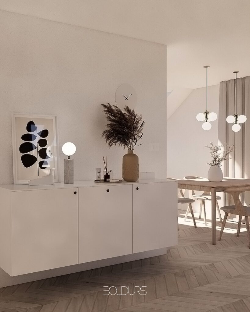 The customer wished for a lot of white and some wood in her interior. She wanted clean lines and minimalism but with character and warmth. A few gold accents and a kit-kat ceramic wall covering gave the otherwise white kitchen a lot of character. Combined with the subtle warmth of wood in the dining room, the interior becomes warm, bright, and inviting.