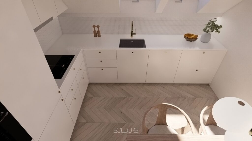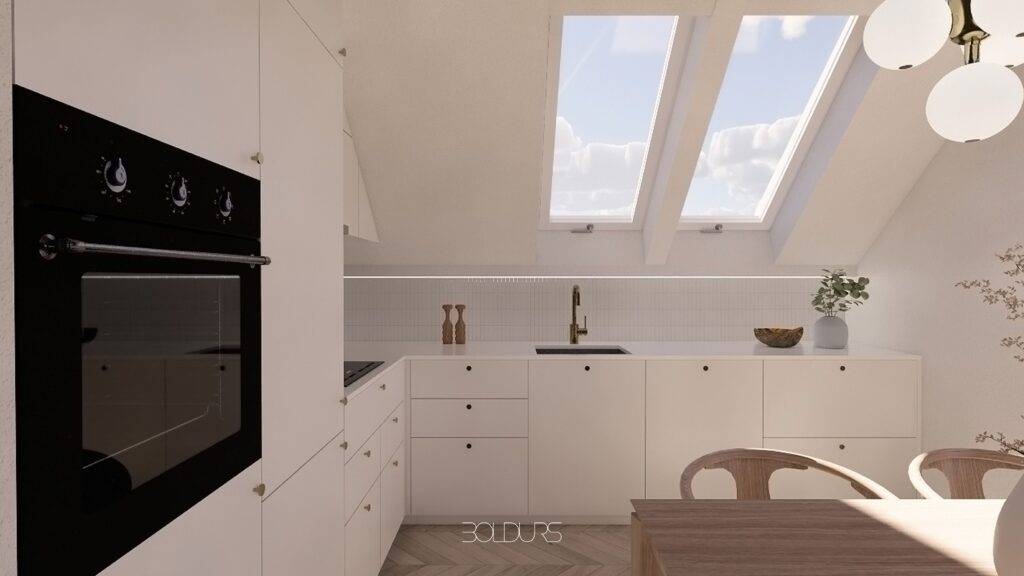 White represents a timeless elegance while also creating a clean and fresh look. In this kitchen under the slope ceiling, it also helps create the illusion of more height and depth, giving the room a more spacious and expansive feel.