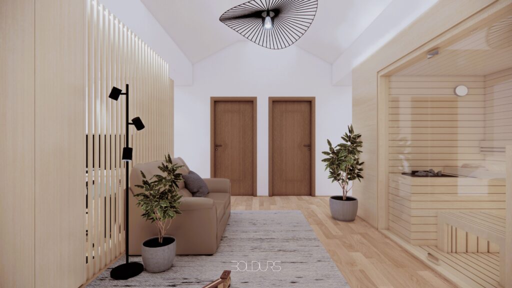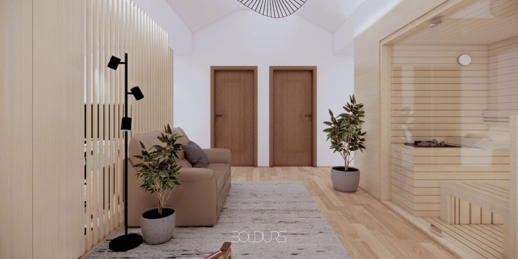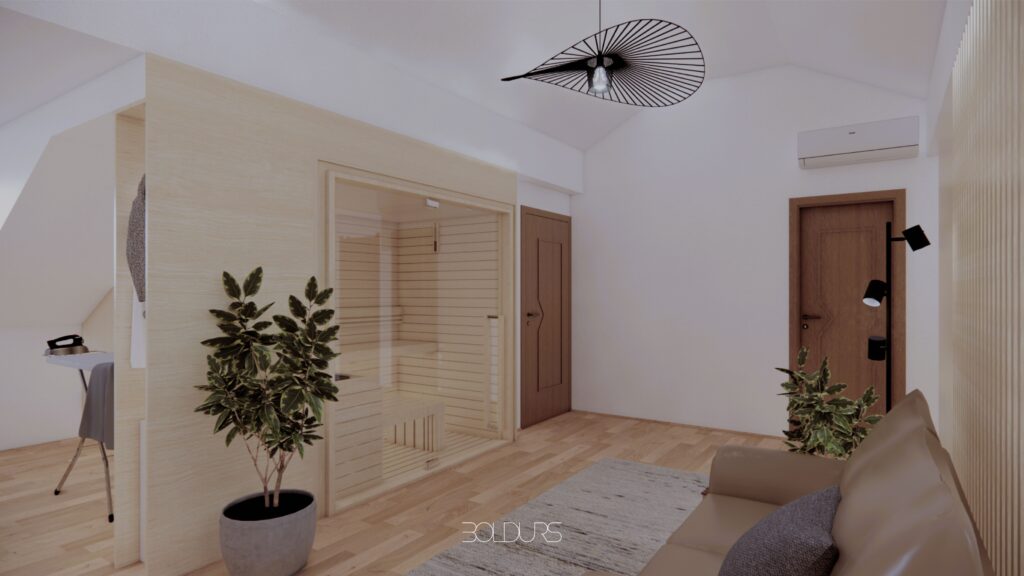 Picture stepping into a tranquil oasis within your home. We incorporated a luxurious wood sauna, not only as a place for relaxation but also as a central element that ties together the entire design. The warm wood tones of the sauna create a cozy ambiance that flows throughout the space.