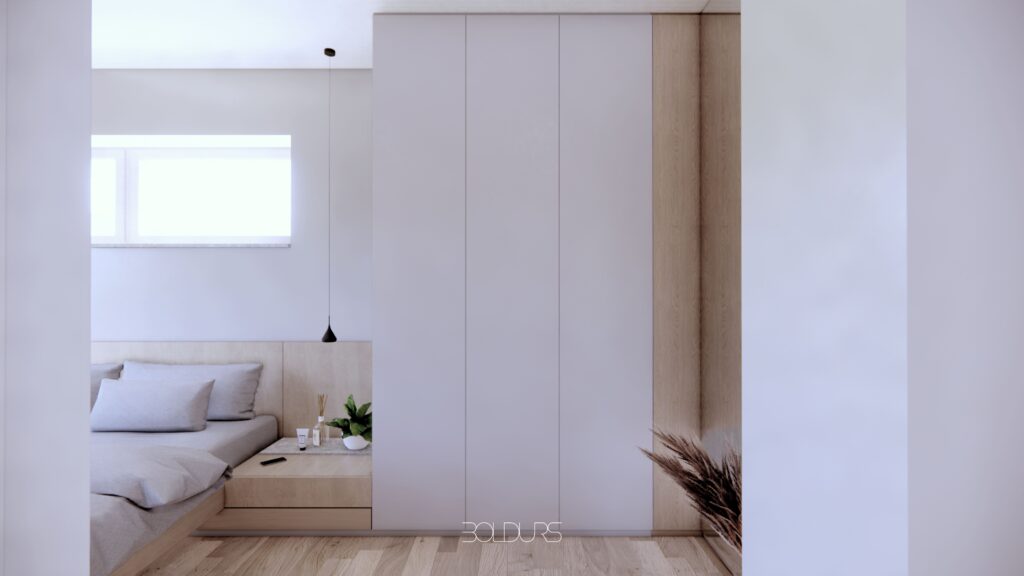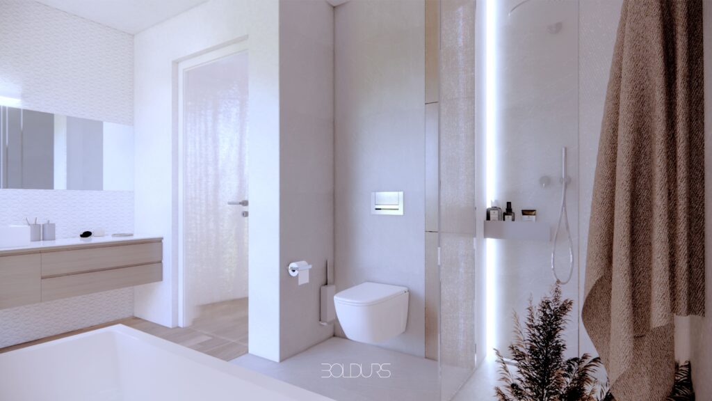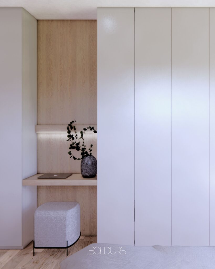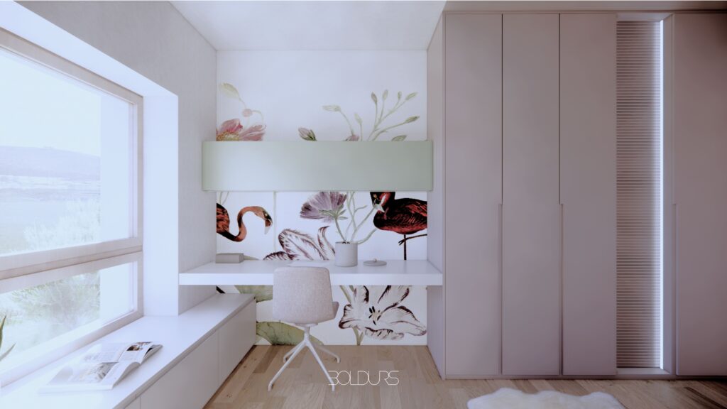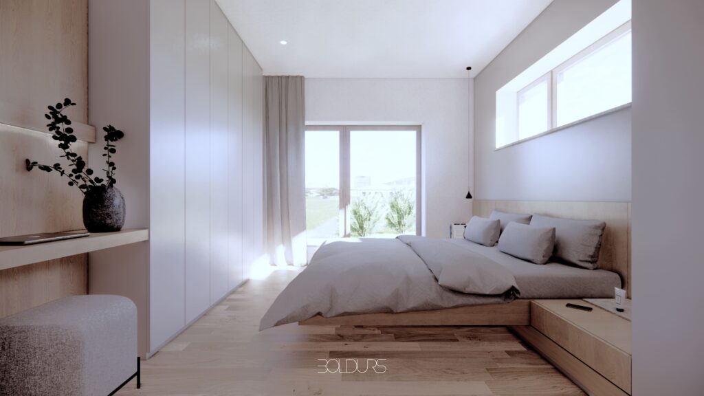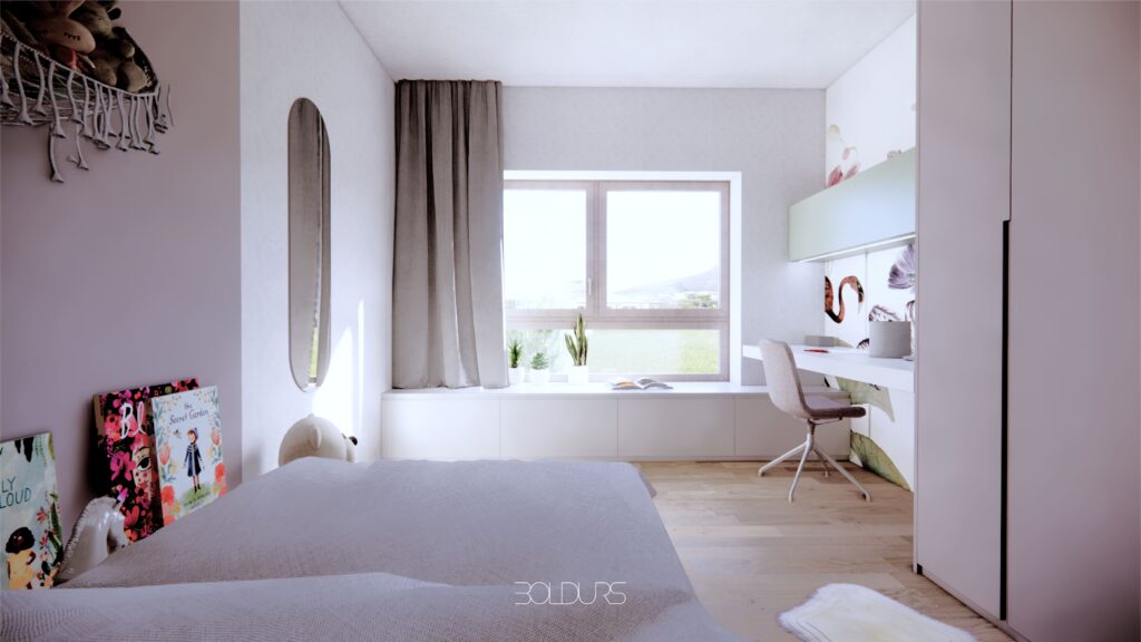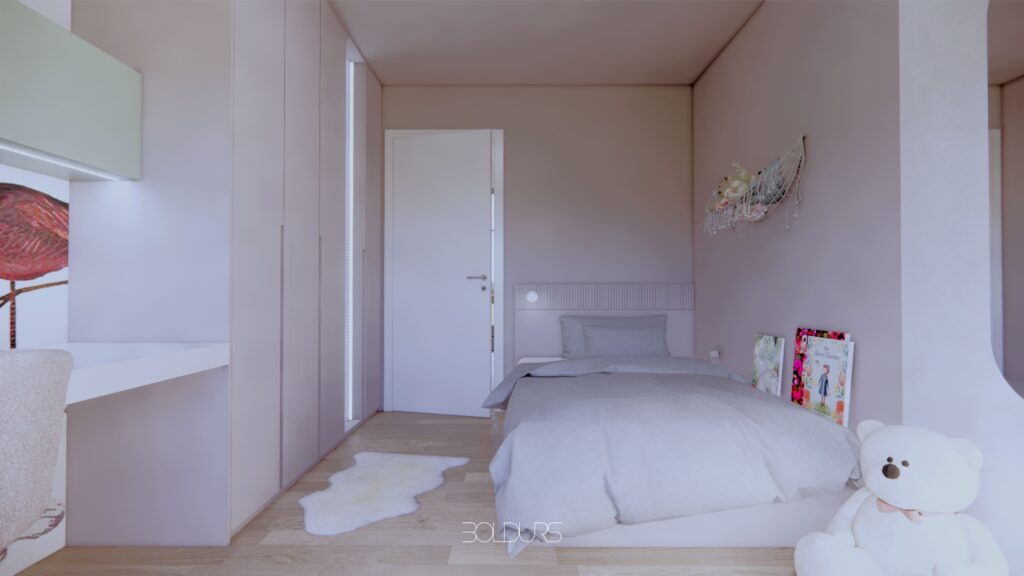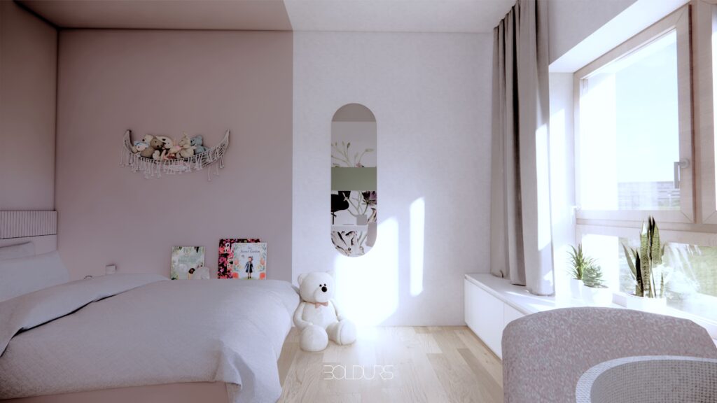Although initially designed with functionality in mind, we felt compelled to reconsider and collaborate with the client to envision some modifications. Notably, we made significant changes to the layout of the fixtures in both the parental and children’s bathrooms. Additionally, we opted to forego the dressing room in the master bedroom. While walk-in wardrobes are undoubtedly attractive, this one seemed narrow. Therefore we decided on a classic arrangement of closets inside the bedroom, and even increased the storage capacity.