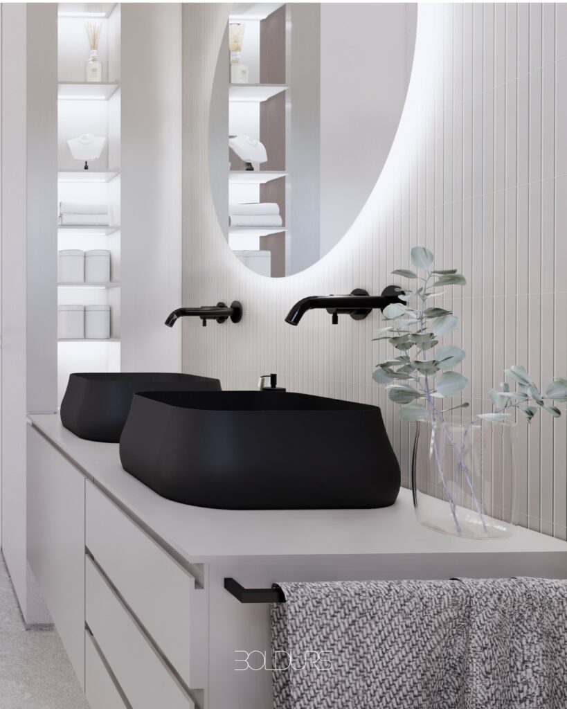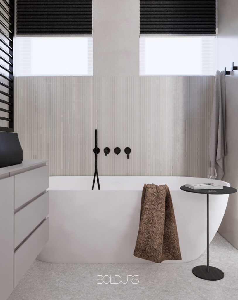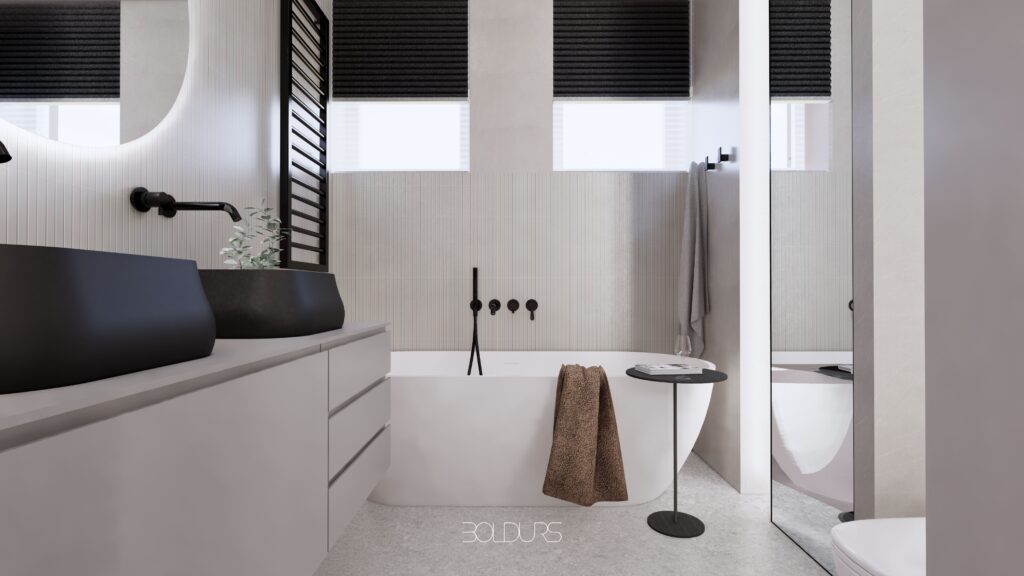 To the right of the entrance lies a shared bathroom, thoughtfully designed with a freestanding tub as a centerpiece, two countertop washbasins, ample storage, and discreetly tucked away washer and dryer facilities.