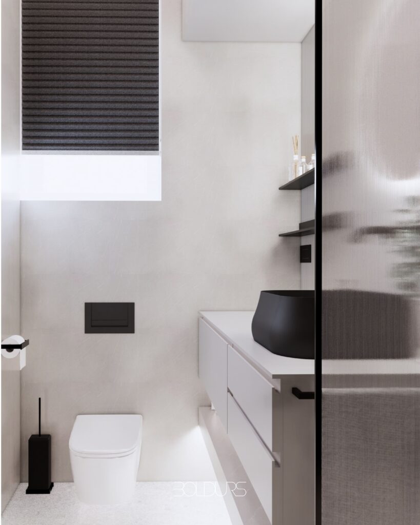 Straight ahead, the luxurious bedroom awaits, complete with a sumptuous bed, sleek wardrobes, and a cozy work corner bathed in natural light from the window. A door from the bedroom opens into the master bathroom, featuring a chic sink, toilet, and a stylish walk-in shower, offering a perfect blend of comfort and functionality.