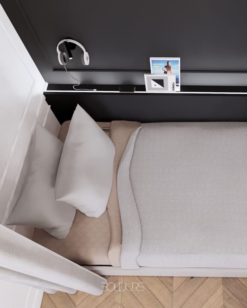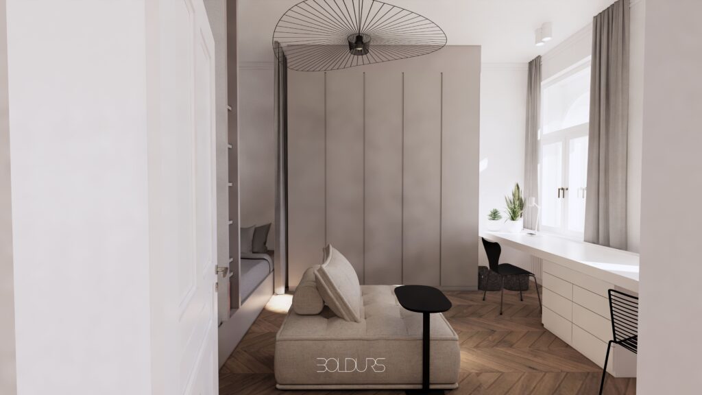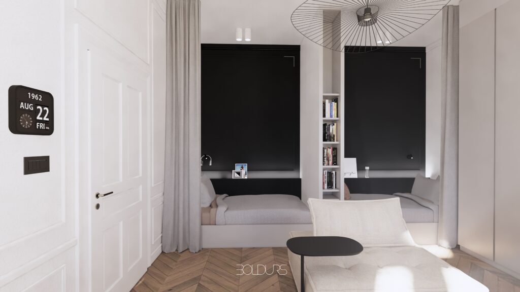 From the living room, a door leads to yet another space – a teenager’s room designed for a boy and a girl. Separated by a privacy wall and individual curtains, each bed provides a cozy sanctuary for sleep and relaxation. The room is equipped with spacious desks, while a central lounging area invites joyful moments of socializing with friends.