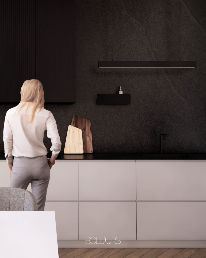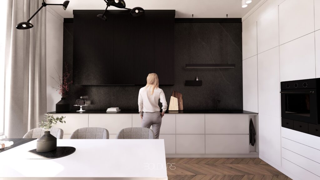 Upon entering, guests are greeted by an entrance area that lacks natural light, so we used light colors and materials. The front door stands out with its old-town design in black. On the left side, two doors invite exploration – the first leads directly into the bright and spacious living room, while the second, hidden behind sliding doors, reveals the modern kitchen and dining room.